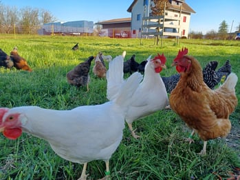 Unsere Ladys! Viva, Vreni und all ihre Freundinnen liefern uns fleissig jeden Tag frische Eier und geniessen ihr Leben im grosszügigen Gehege mit viel Grün.